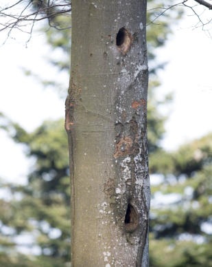 Arbre à 3 loges, on devine que celle du haut est la plus récente. Celle du bas est cicatrisée. Des traces de coups de becs sont visibles sur le tronc.